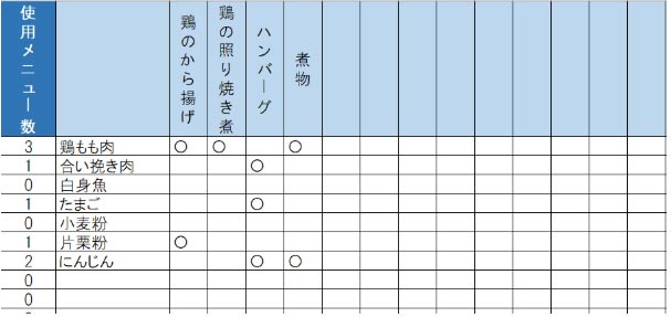 メニューを組み立てる際に、食材とメニューを相関表にまとめながら考えると一目瞭然です。