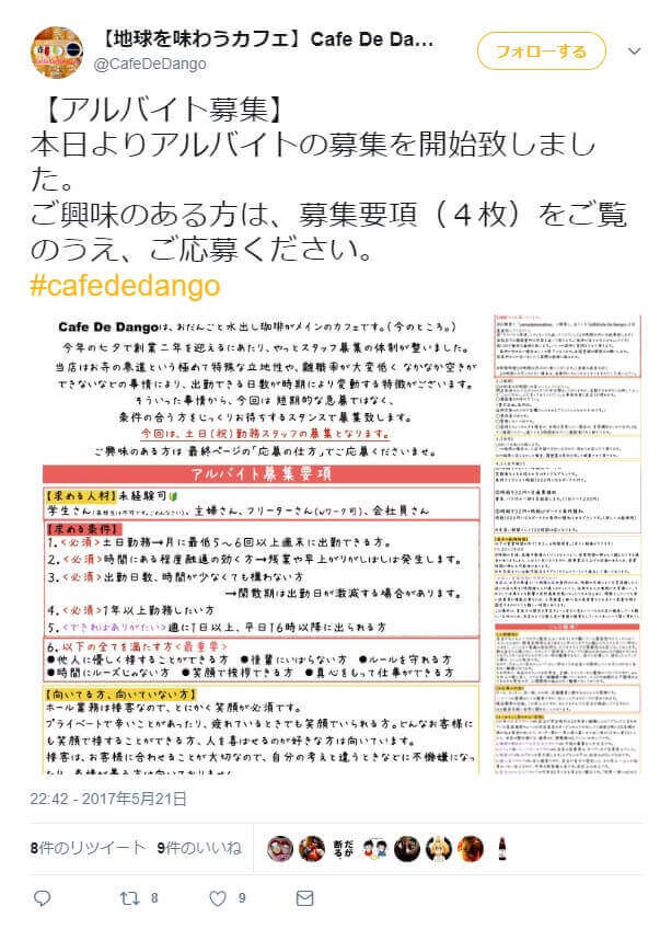 Cafe De Dangoでは4枚に渡る募集要項を作成。雇用のズレがないように以下のような工夫がされています。