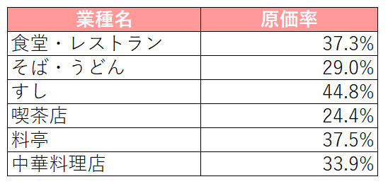 目安となる各業態の原価率は下記の様に異なります。(※必ず下記数値に合わせなければいけないわけではありません。)