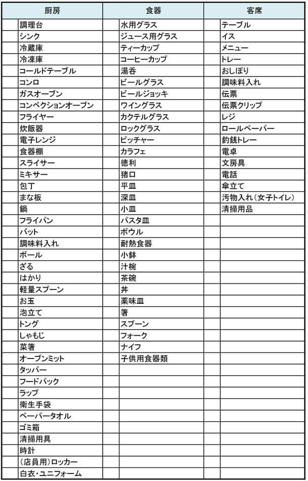 厨房で使う「調理用備品」とフロアで必要な「客席用備品」に分け、もれがないように考えていきます。