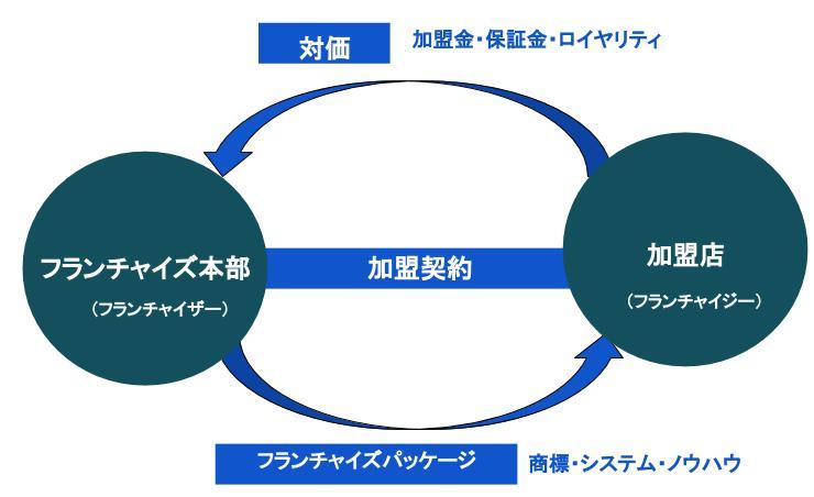 フランチャイズとは、「フランチャイズ本部と他の事業者(一般の個人や法人)が契約を結び、権利や商標、ノウハウなどを提供する」経営システム。