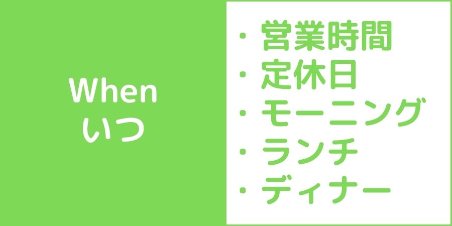 それから次の「When」は「いつ?」ですが、これは飲食店の場合には営業時間のことですね。