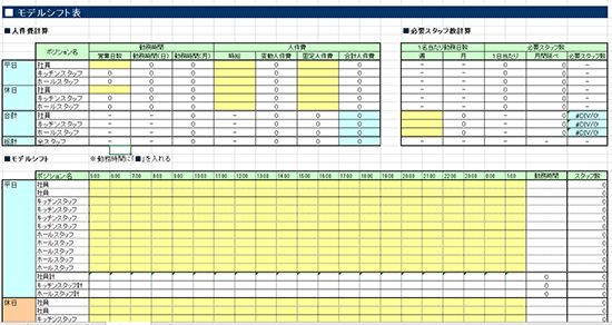 店長、社員、アルバイトのシフト体制を組んだり、そこから必要な人員数を割り出す際に使用するツールです。人件費についても、概算で計算することが可能です。